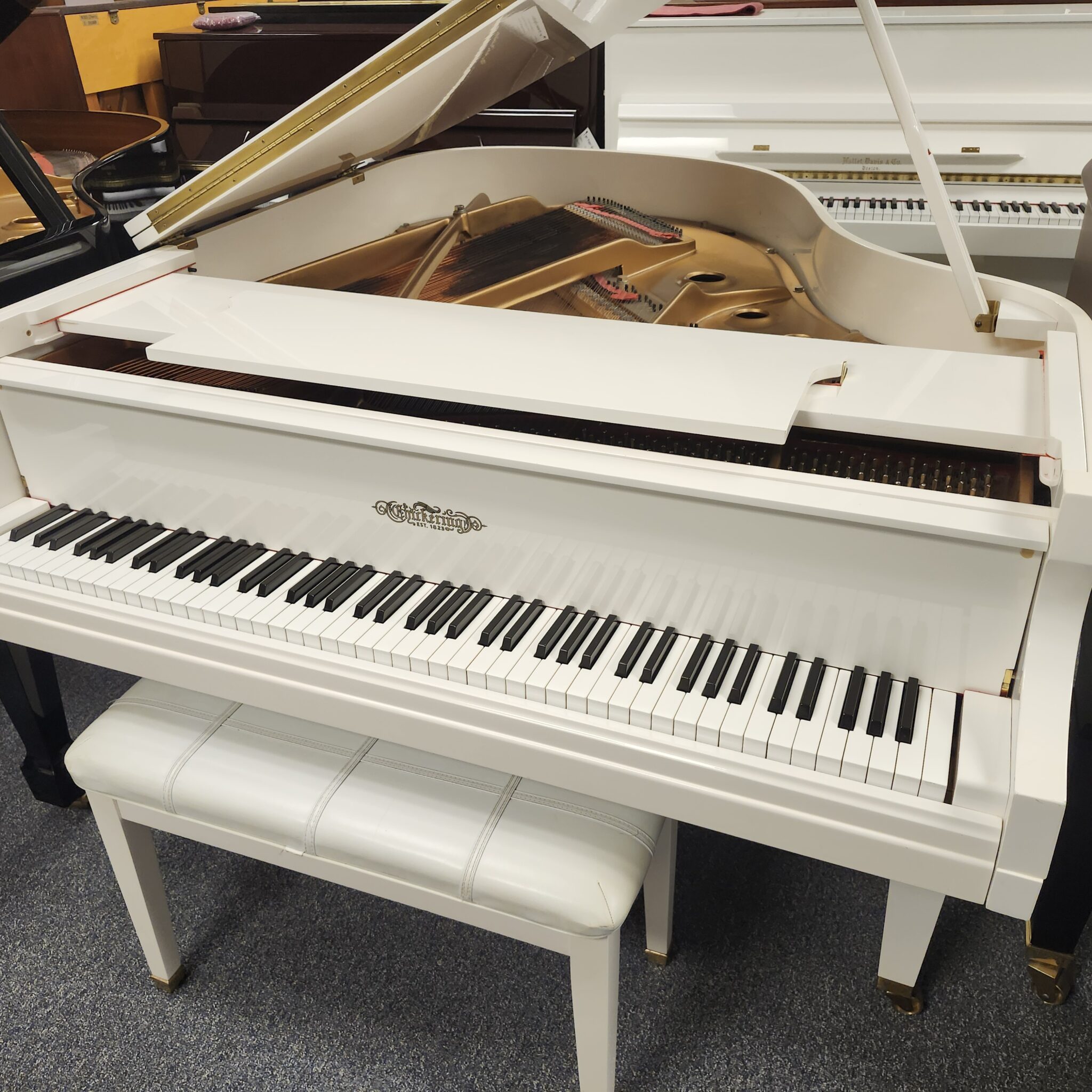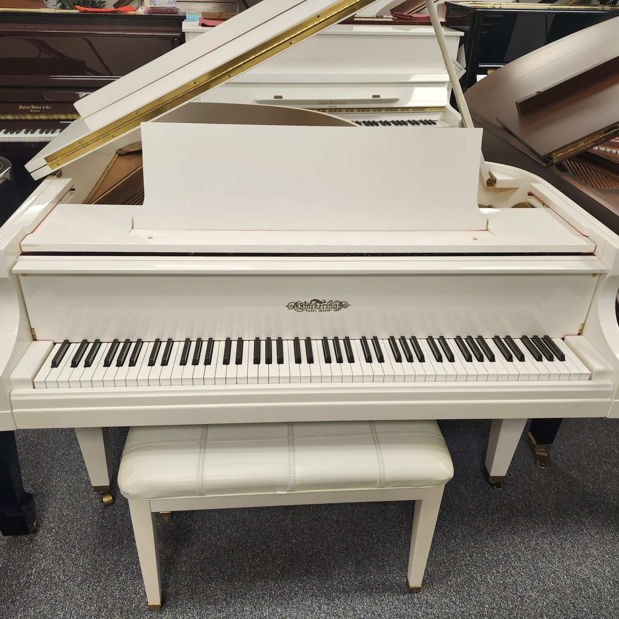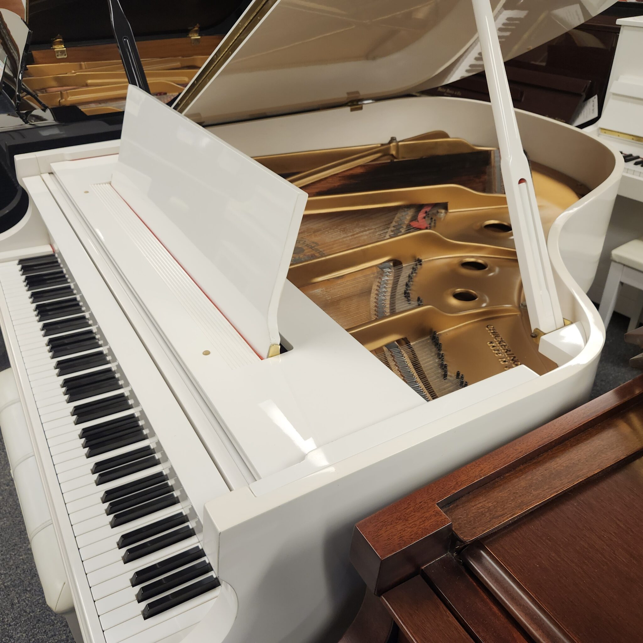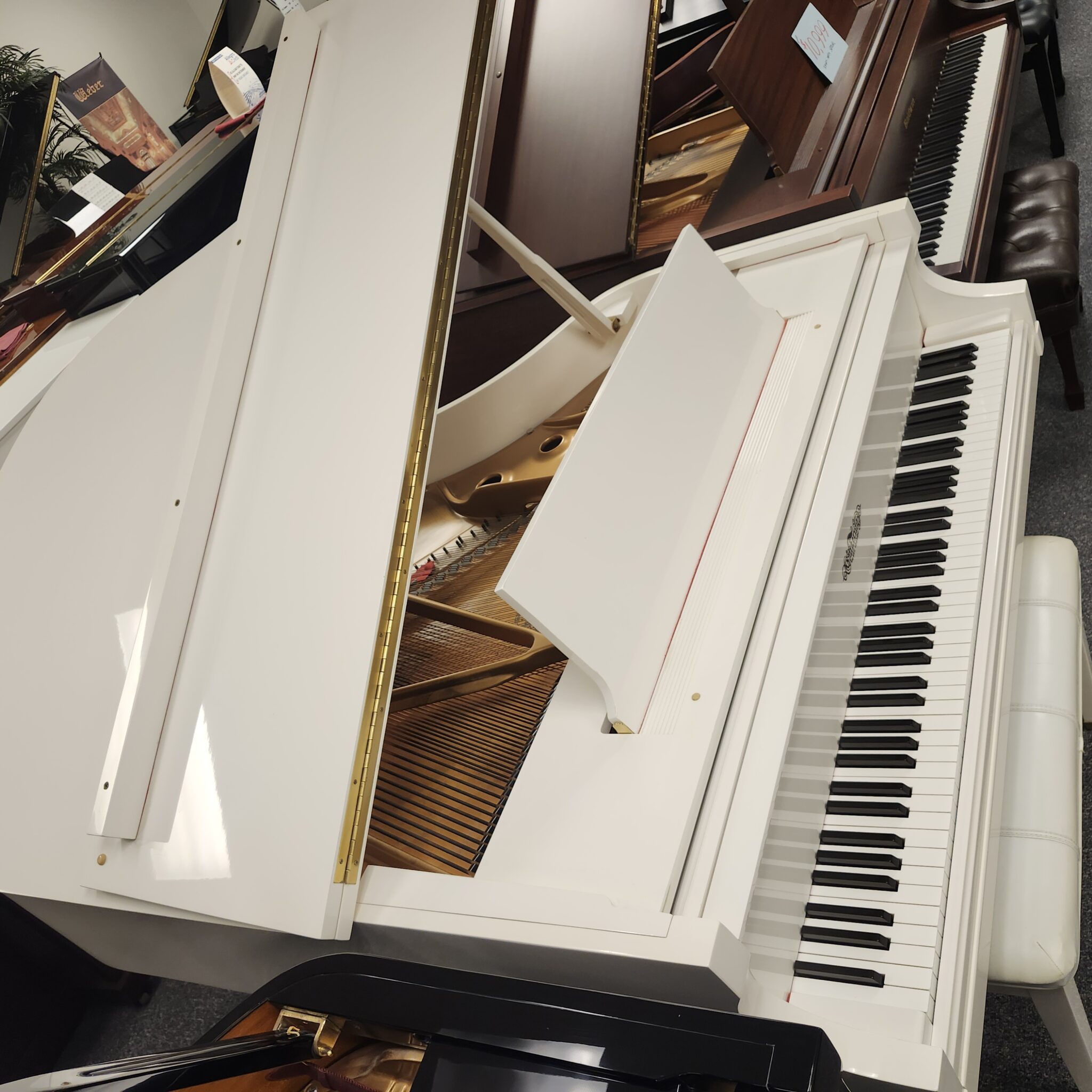 This Chickering Special Edition White Parlor Grand was hand-made by the Baldwin company in 1996, and lovingly kept in one family.  The 5’7″ parlor grand was specially made with a glossy white finish.  The tone is warm and traditional American, and the touch is moderate and less deep than some grands.  A fun piano to play and a fine showpiece where white can be featured.  Won’t last!
