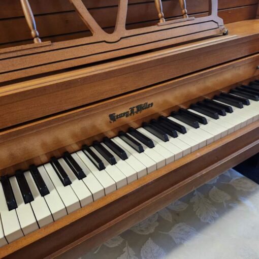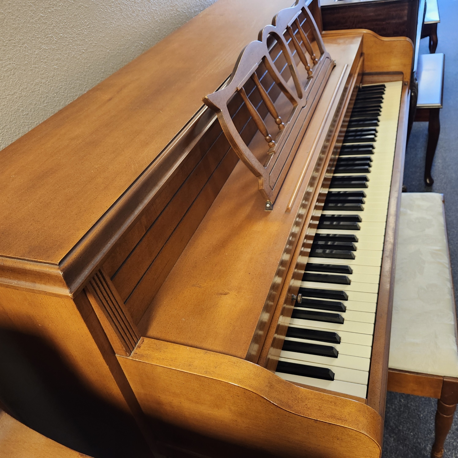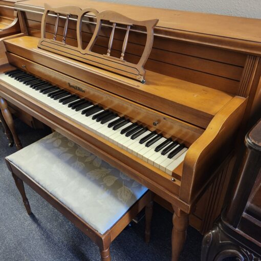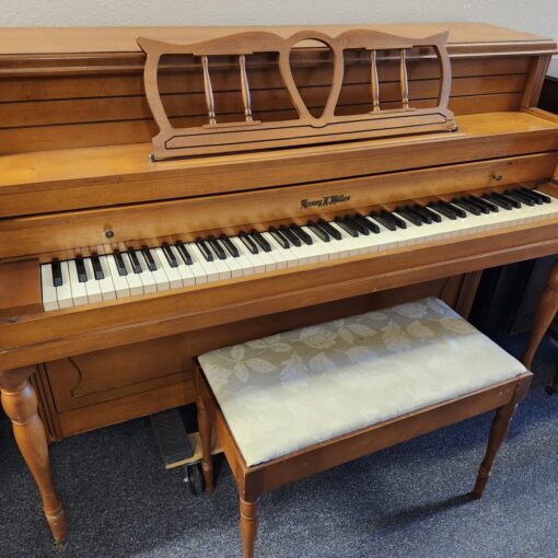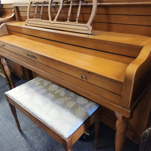 This Henry F Miller Golden Oak Spinet is a lovely little upright piano with character. The wood cabinet is shaded quite a light color, with a golden glow to it. The cabinet lines are simple and fairly neutral, so that there are many rooms that will flourish with such an accent. And it is a fine little piano, with a bright clear tone that resonates quite well. Easy to play, with a moderate light touch. This will be a fine practice piano for a learner or intermediate player who wants a real piano to enjoy. Includes matching storage bench.