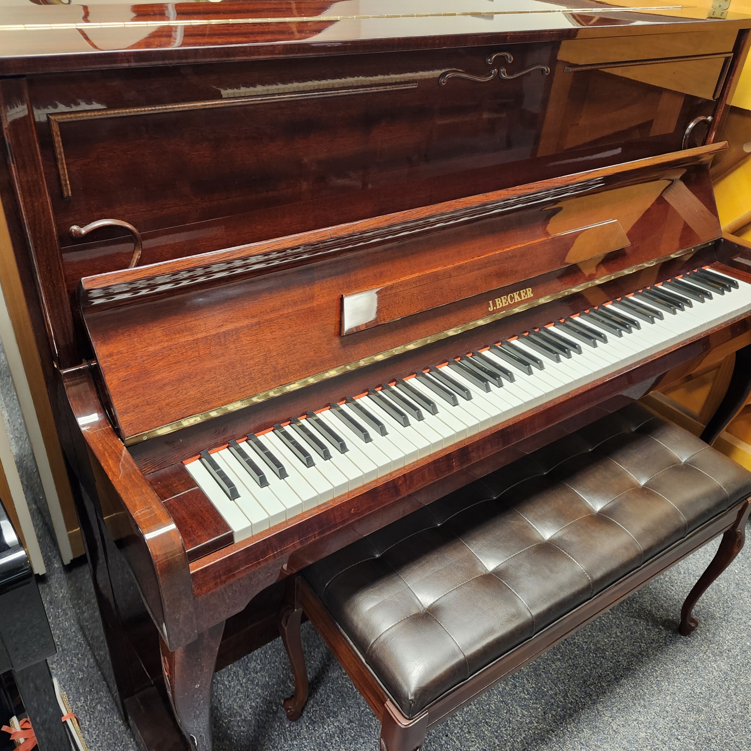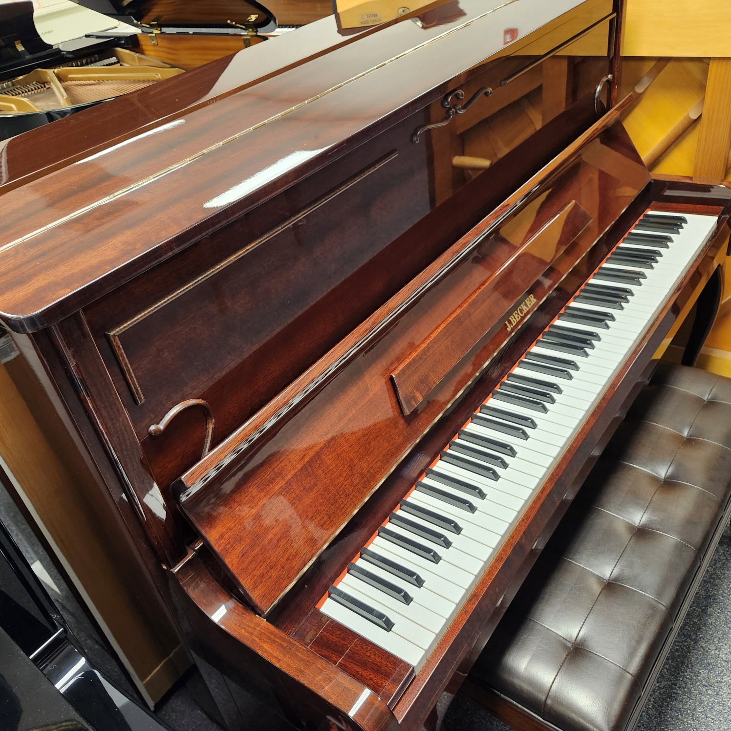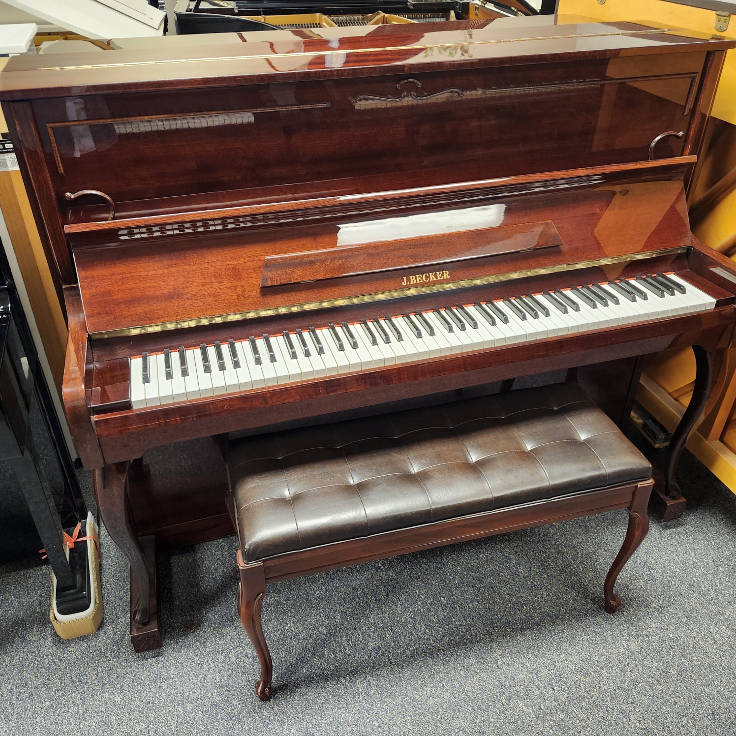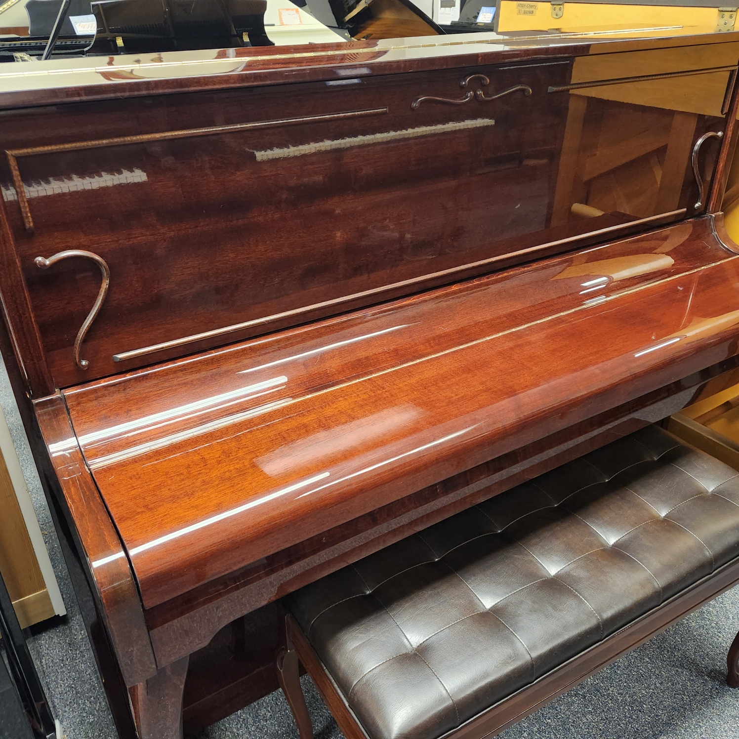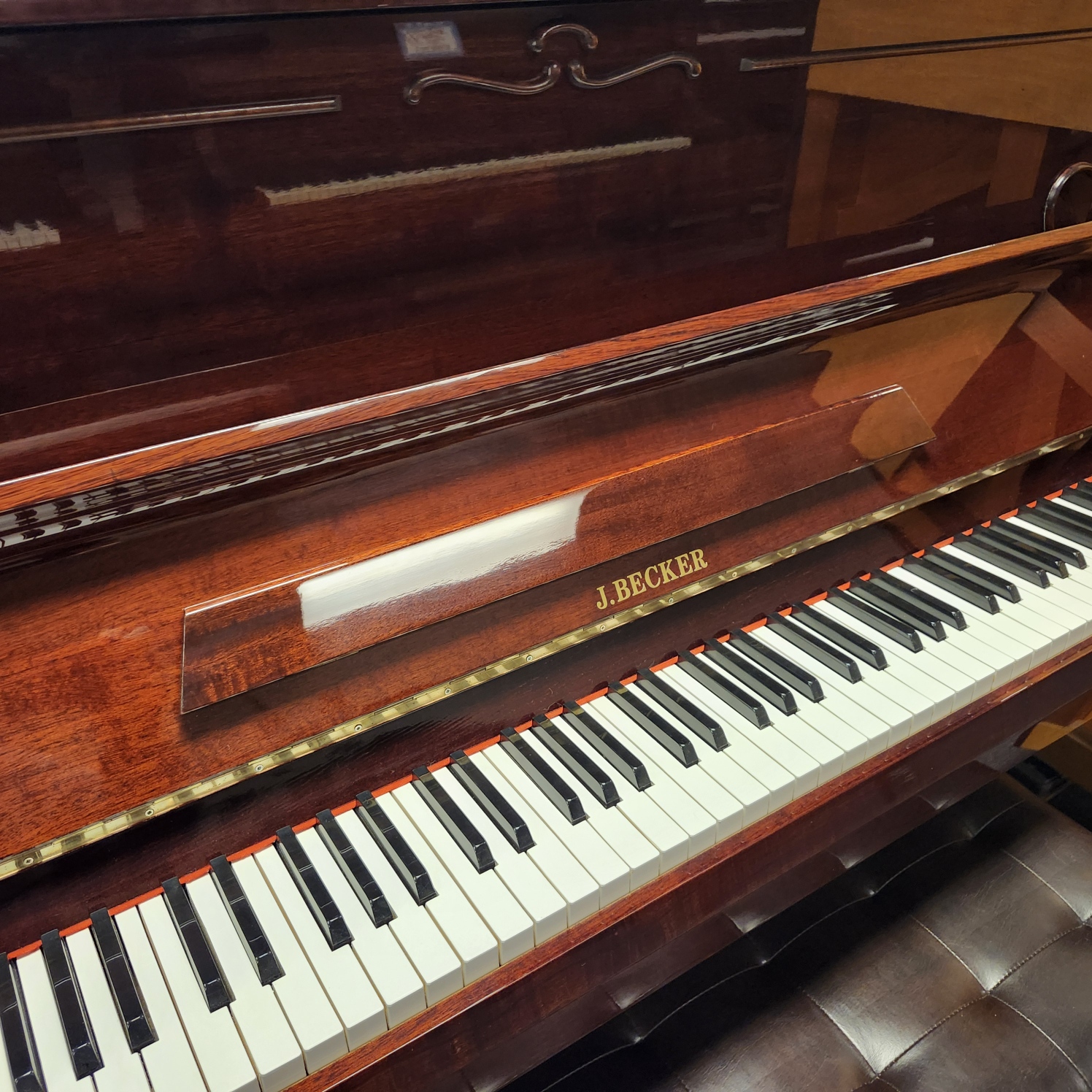 This J Becker Mahogany Studio piano was never actually sold since it was new almost 30 years ago. So it is an amazing value, on a lovely piano with an elegant appearance. Hand-carved scrolling and flowing curved legs make this one stand out. And it was made in Eastern Europe where piano-making has been a tradition for generations. Warm tone, this one will please classical or traditional players who favor a blending tone that isn’t overly sharp. This color and price range don’t last long.