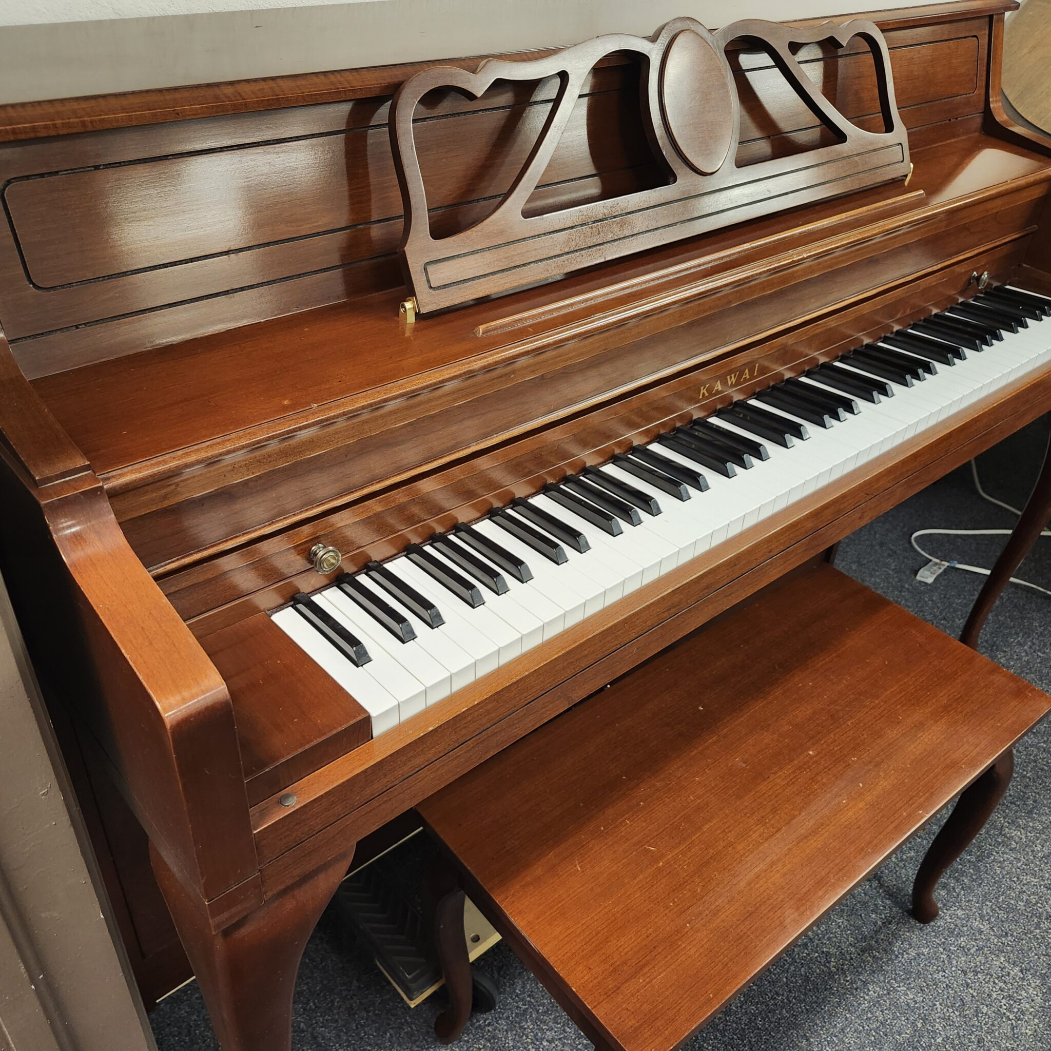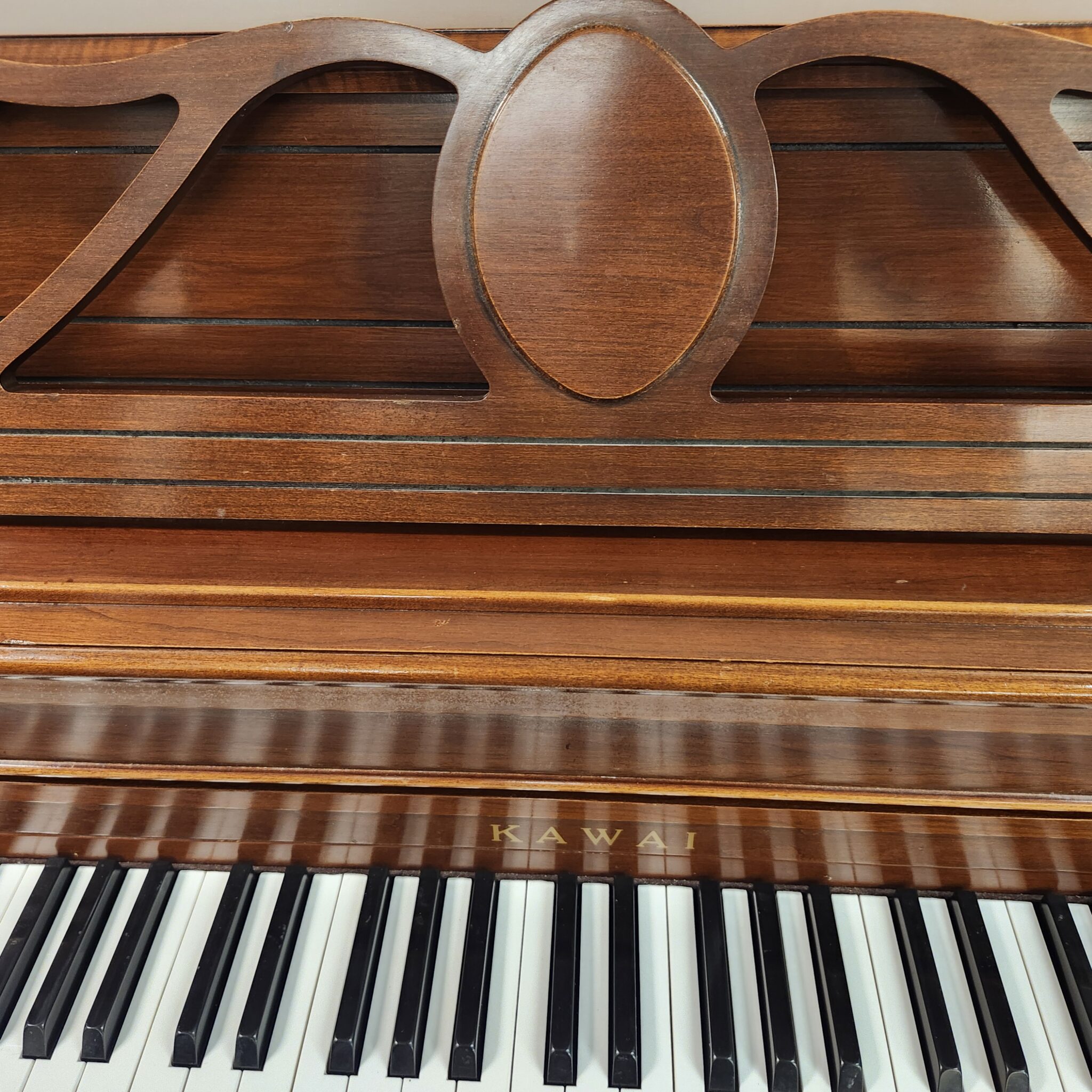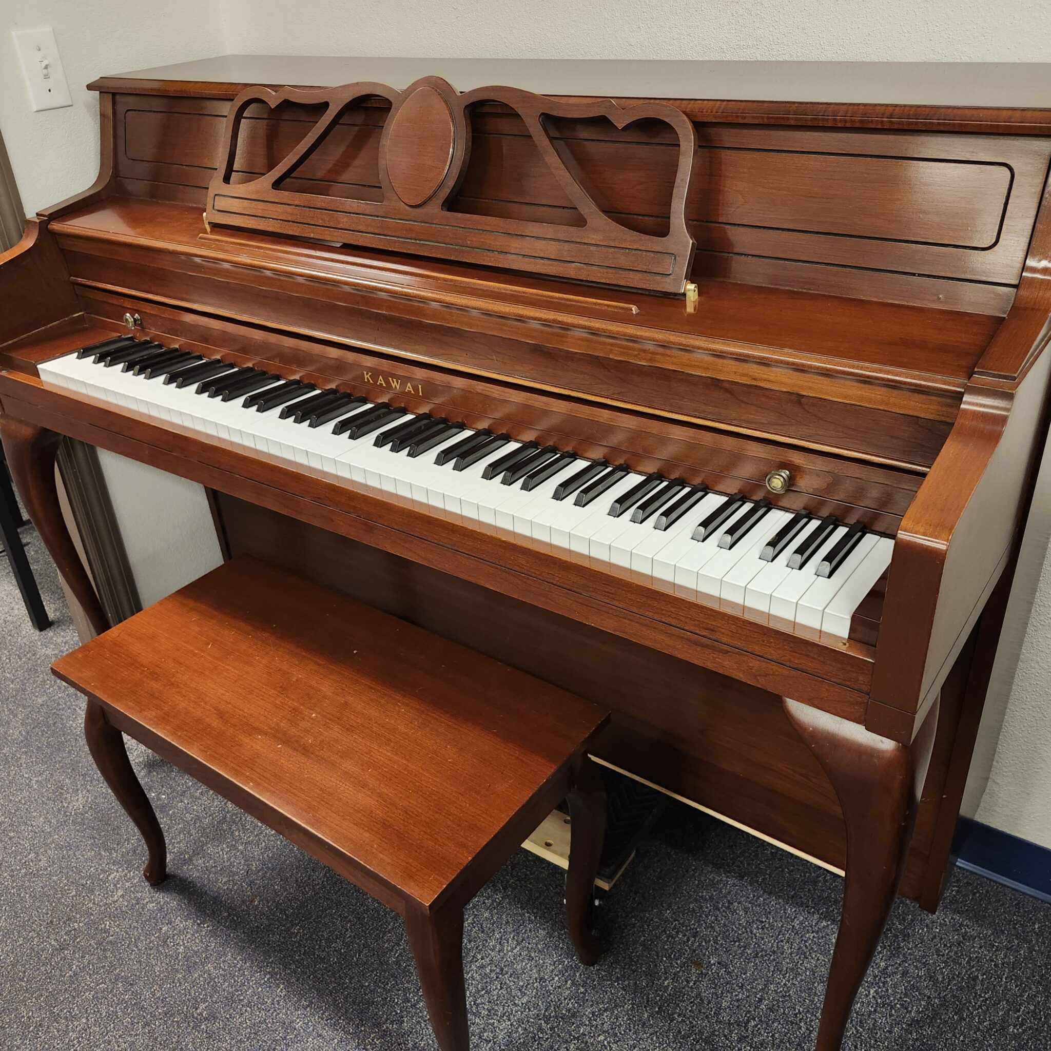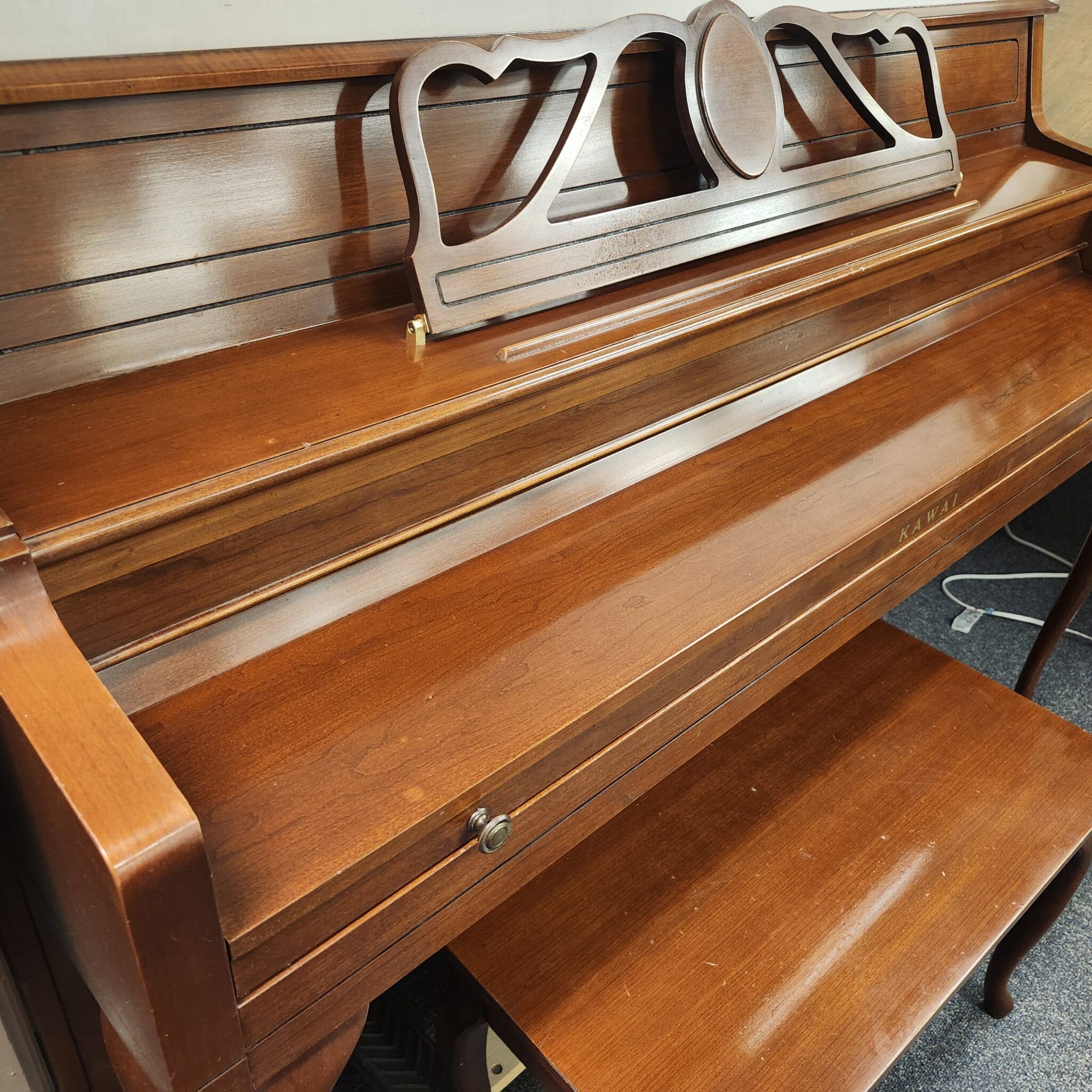 This Kawai Cherry Console was made in 1990 in the U.S. and has a lovely tone. The elegant lines of dark wood in the provincial style make this an attractive addition to any home. And the touch will be appreciate by players at nearly any level. This one was meticulously cared for, and will be a nice find for someone favoring dark wood. Kawai is one of the two top Japanese companies, and it is the one that is considered most environmentally conscious. They have made world-class pianos since 1927, much longer than most Asian companies.