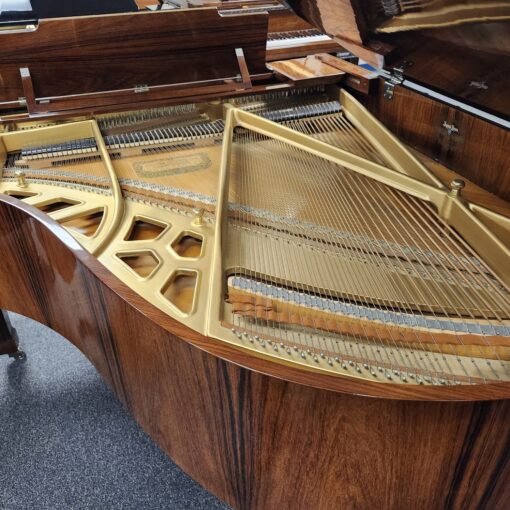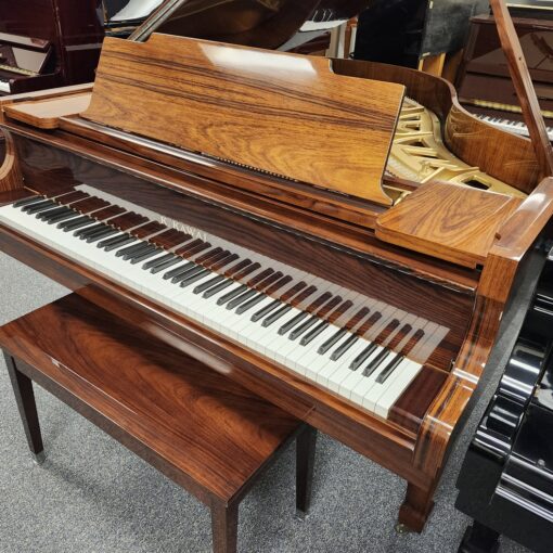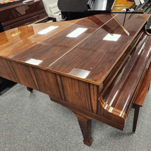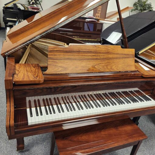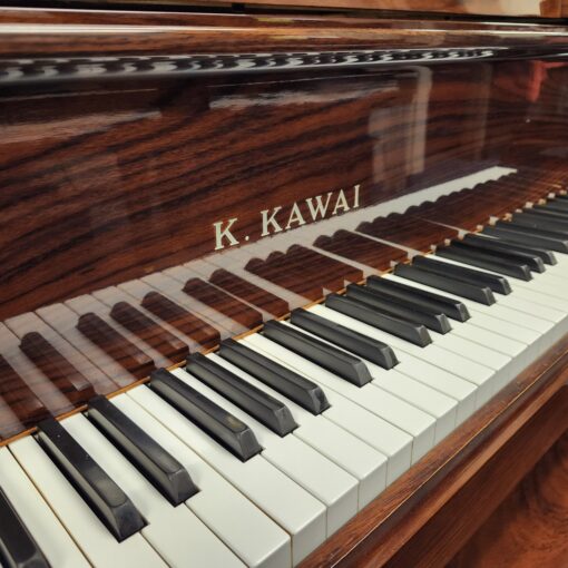 Here is a Kawai Tiger-Stripe Mahogany Parlor Grand which was owned by a top-rate player and musician who cared deeply for it. This is a KG2 model, which is 5’10” in length, and it was made in Japan in the mid-70s when Kawai was really making its mark in the music world. It plays fast and moderately light. And it has amazing tone, which is powerful, sensitive, and capable of a wide range of musical colors. The dark wood cabinet is still very attractive, and the wood grain reminds observers of a tiger’s stripes. When the piano is opened up, it’s hard to even notice the sun fading of its age. Some say the gorgeous wood even makes an exotic appearance. This will help spice up a room, and the player will be thrilled too.