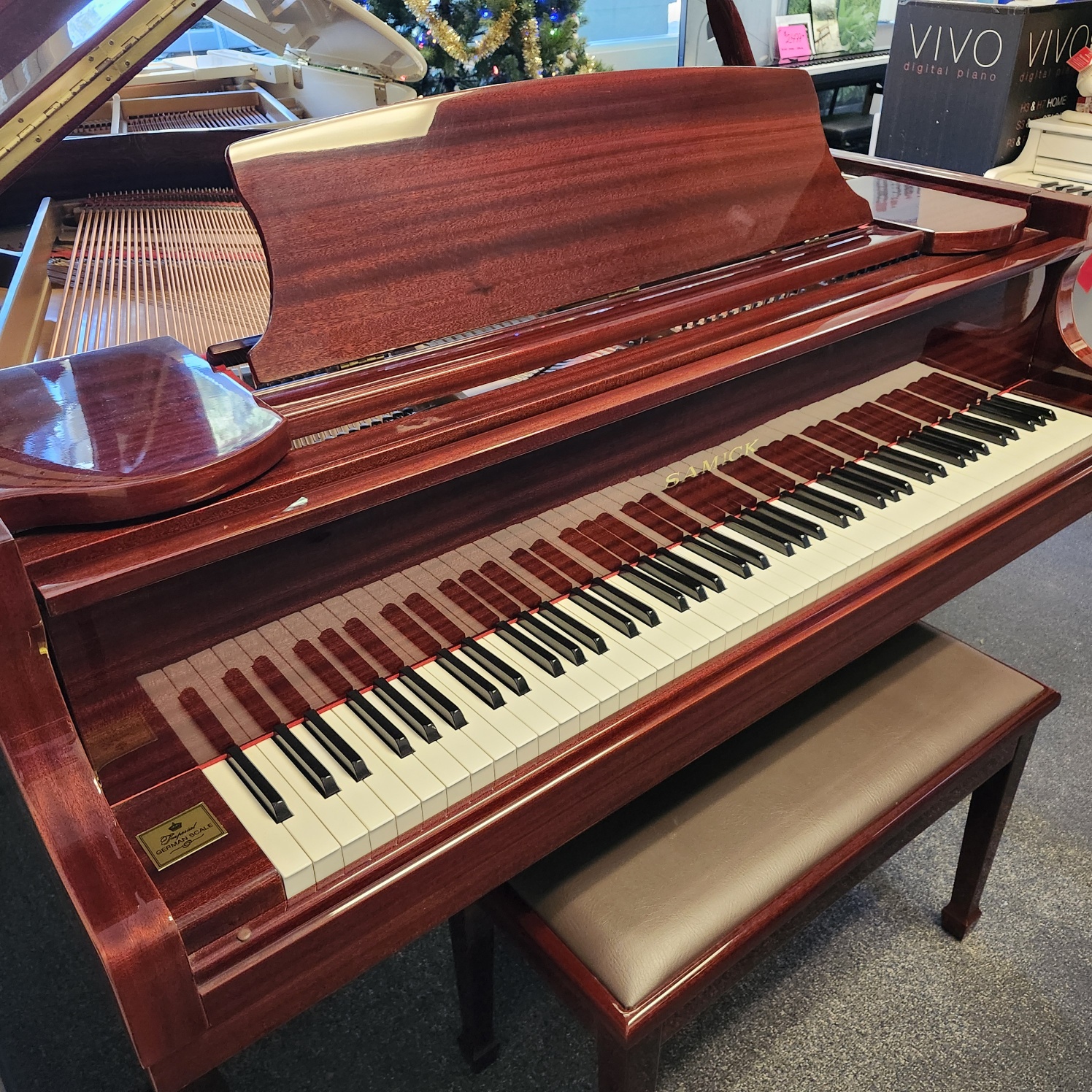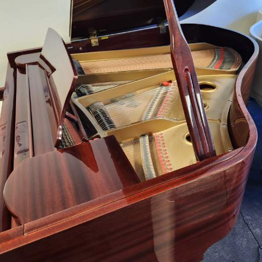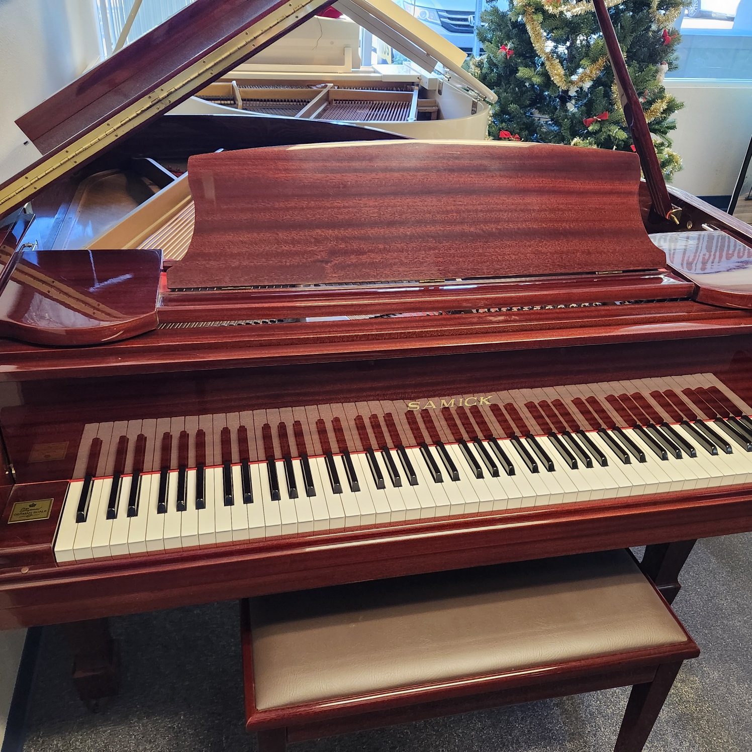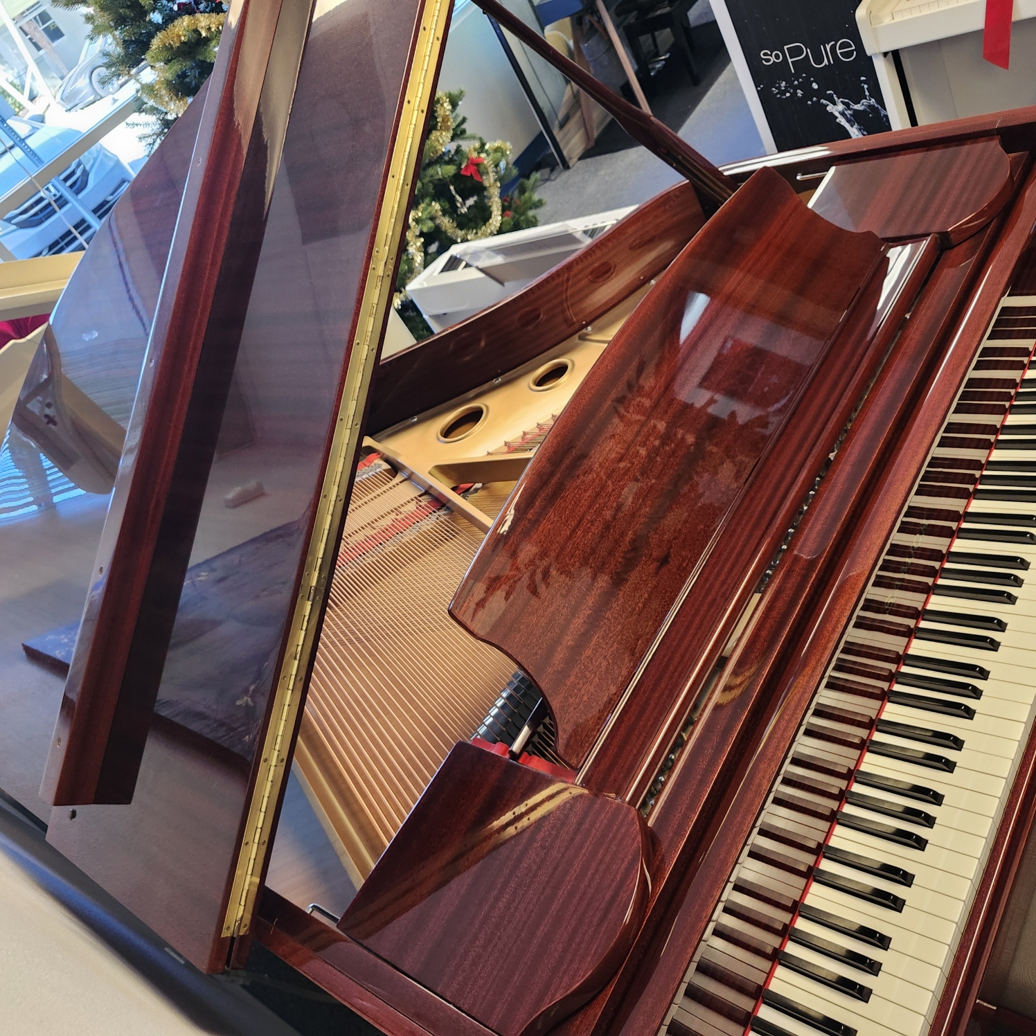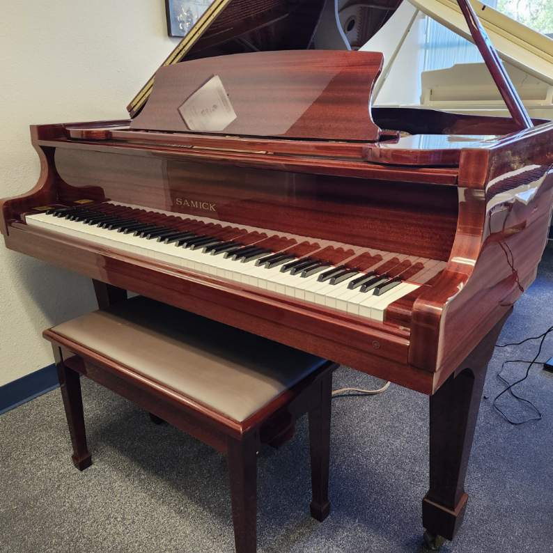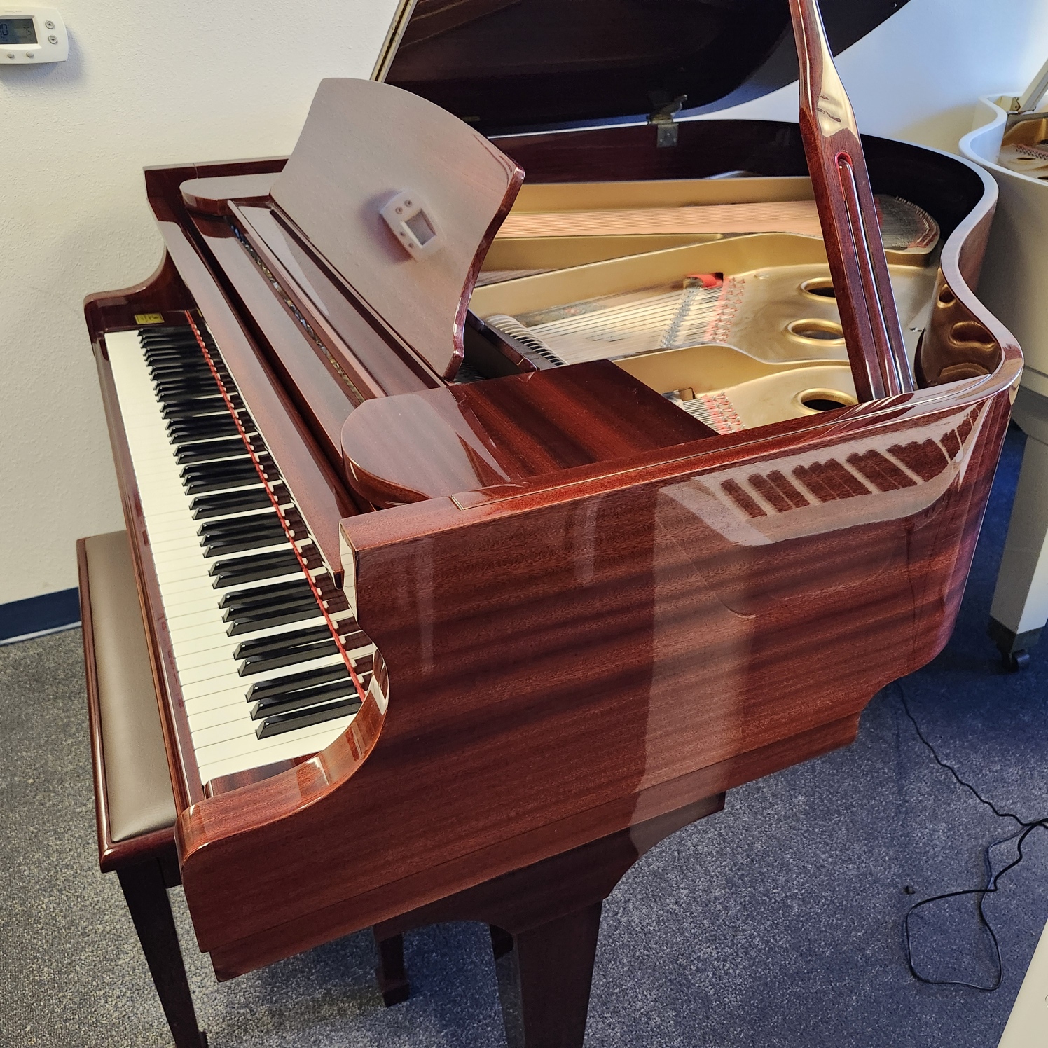 This Nearly-New Red Mahogany Baby Grand is a Samick SG155 piano which makes a stunning presence. It is less than 25 years old and was so well preserved it looks and plays like new. And the color used by Samick is gorgeous, according to everyone who sees it. The 5’2″ size is small enough to fit in most settings, but large enough to fill the room with lovely tone. Players at nearly any level will enjoy playing this piano, and it is one of the few things you’ll ever find that will add both joy and class to your home. Includes matching storage bench. Deliver to your home this week?
