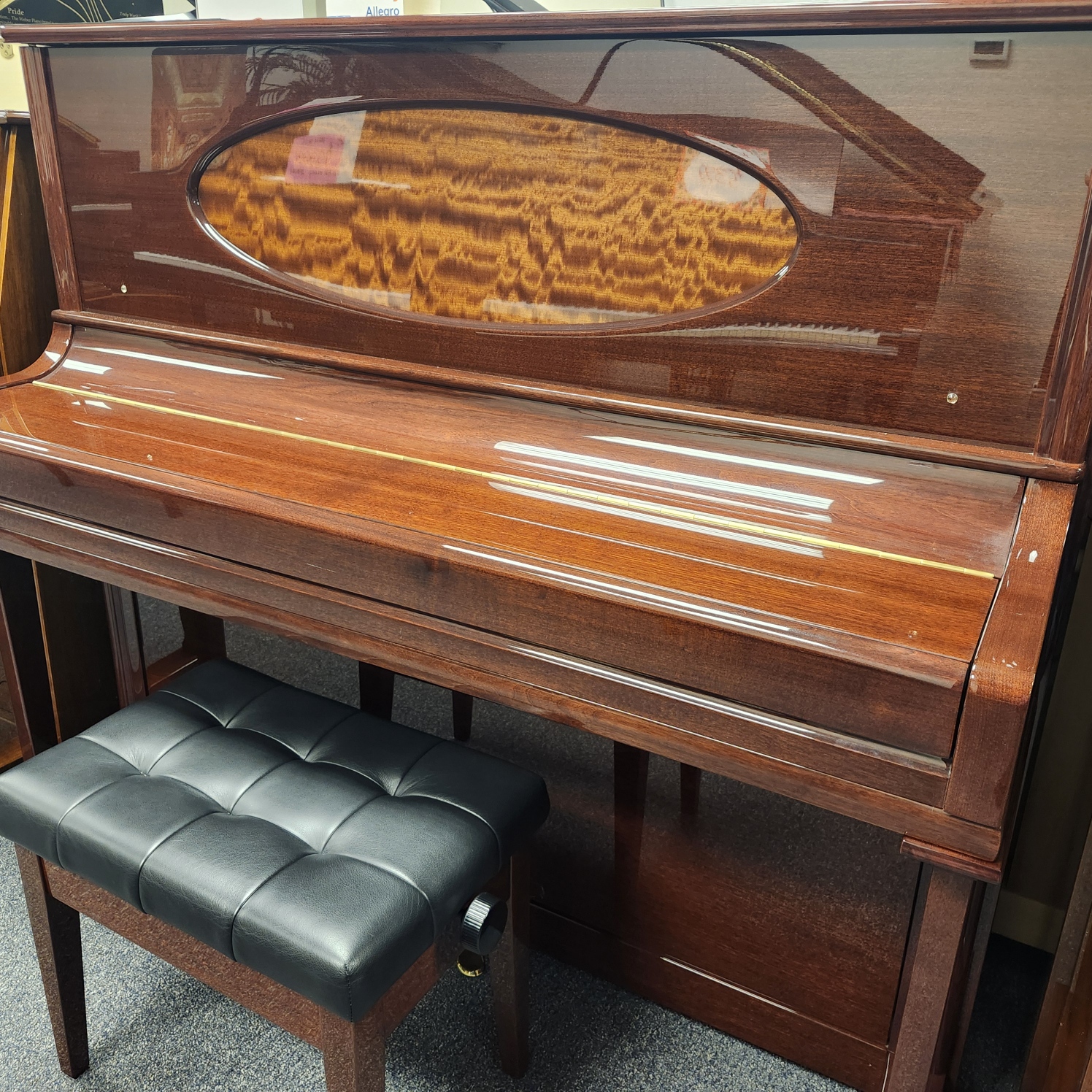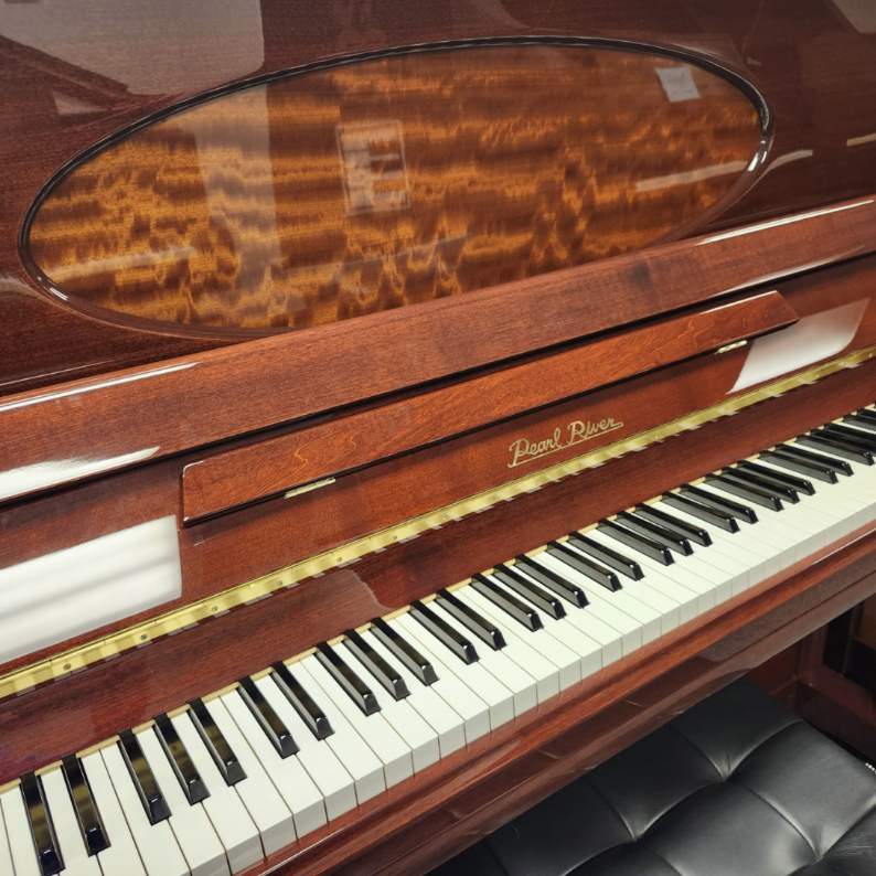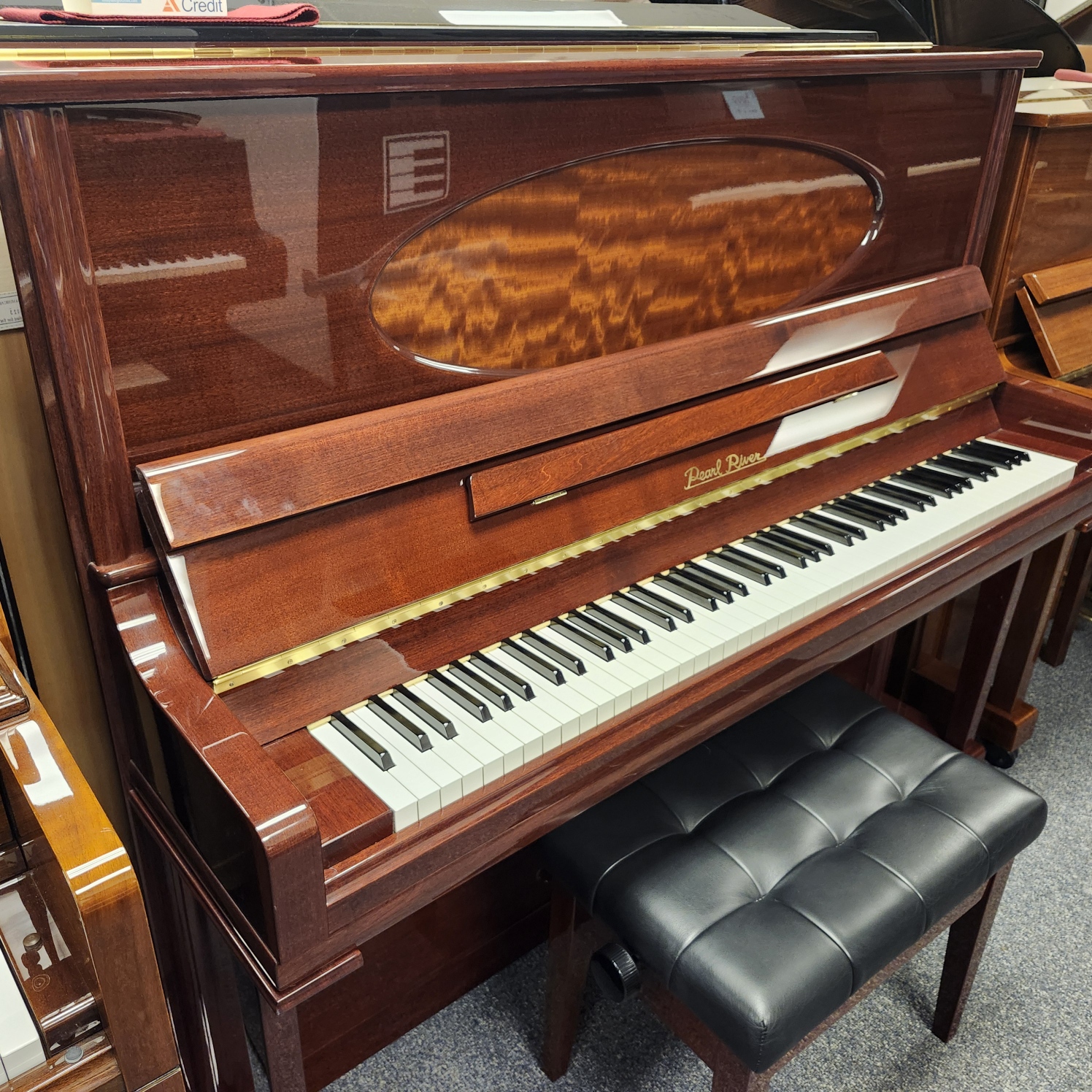 This Pearl River Mahogany Upright Piano is a 51″ Professional Upright that is made to perform. It has similar dimensions and bass strings to a 6′ grand piano, but in much less space. And this one is stunning, with burled mahogany inlay and a striking finish. This piano was made next to Steinway Essex and Ritmuller pianos, made by the same people with the same knowledge and the same woods. Except you will pay a lot more if it has a more familiar name on the front. Responsive action, and a powerful voice. Most players will love playing this piano.