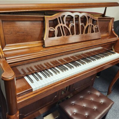 This Samick Brown Mahogany Studio is a beautiful and unusual piano, which will make a striking presentation in the right setting. Most mahogany veneers today are tinted red or burgundy but his retains more of the browns of nature,, almost the sienna hues of the mahogany tree. Nice grain, clearly visible beneath the high-gloss finish. And it is a lovely instrument too, with excellent clarity and intonation, in keeping with the top Asian pianos. Nice find and an amazing value.