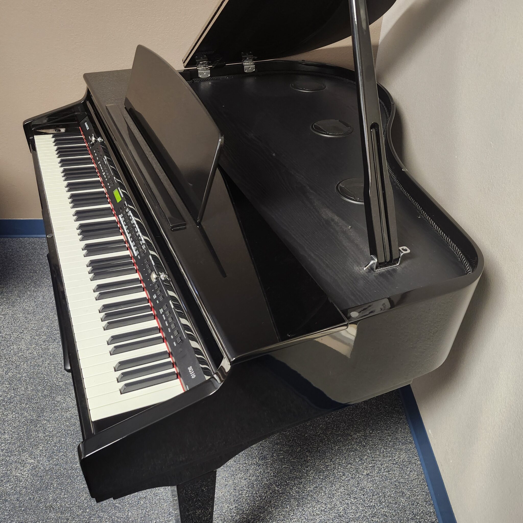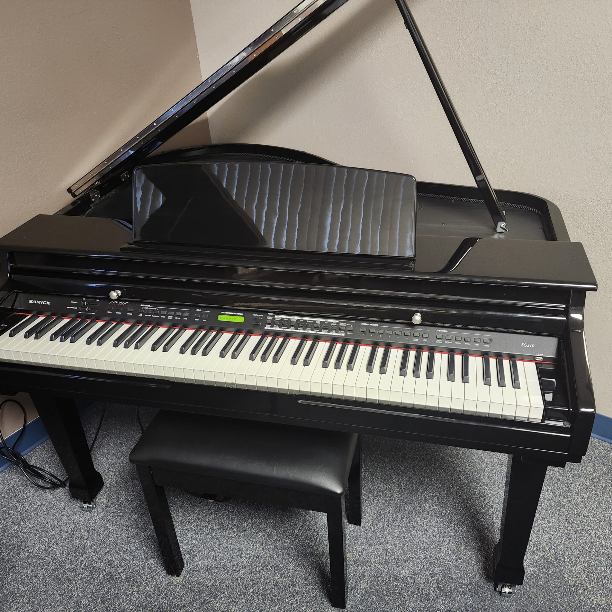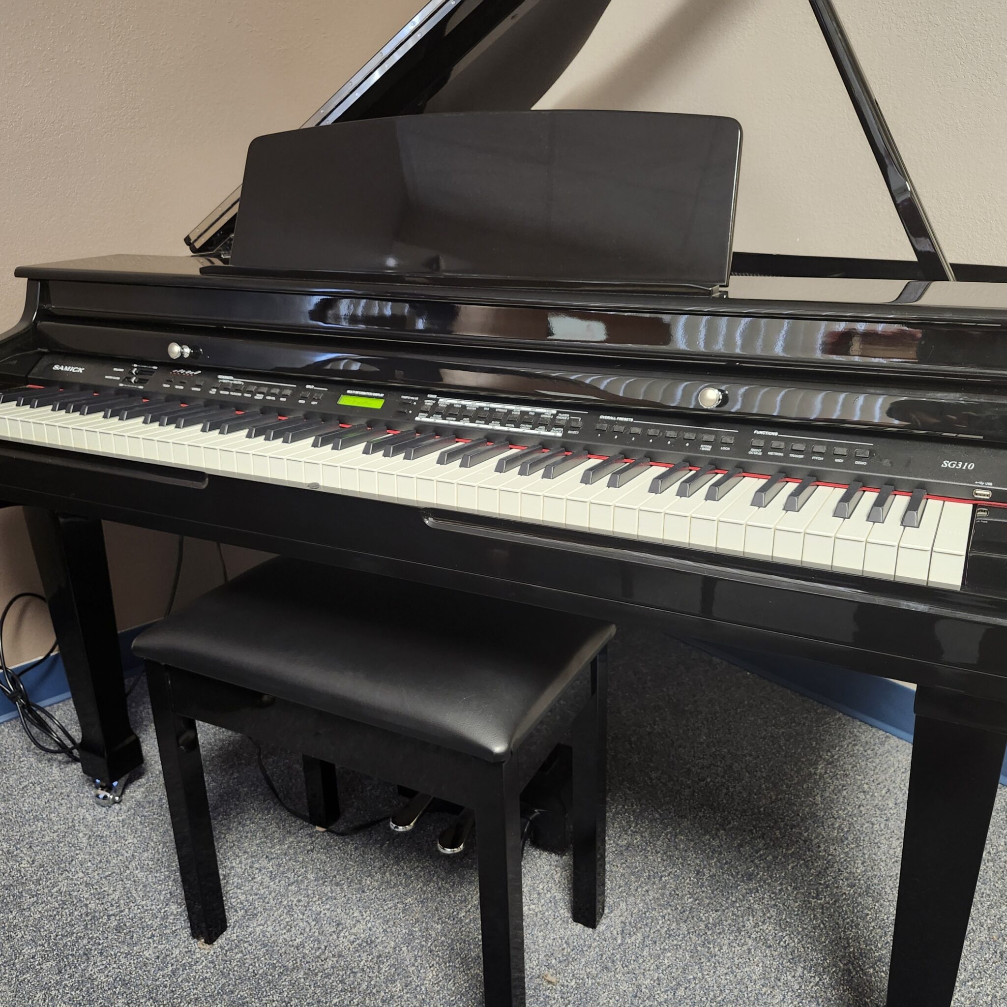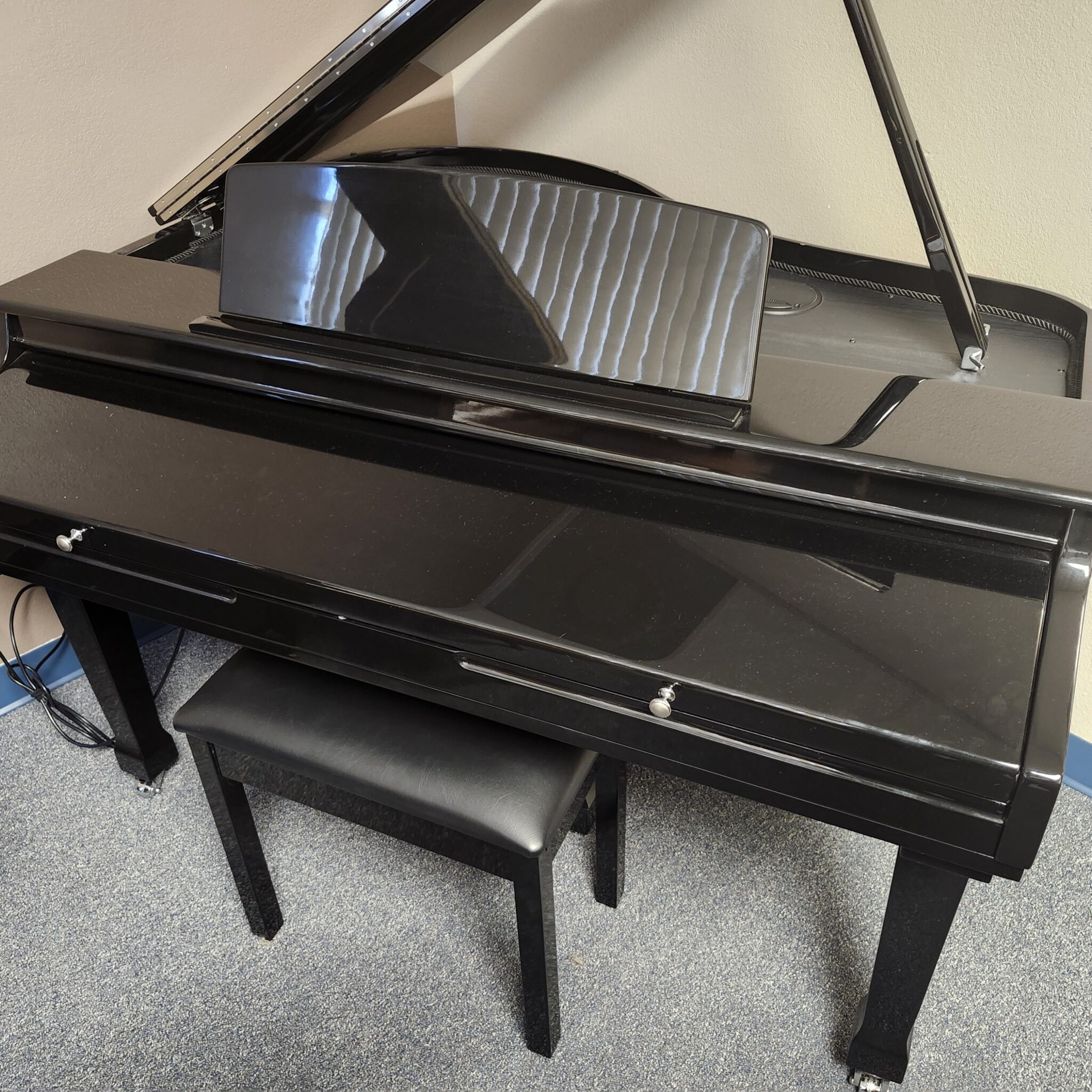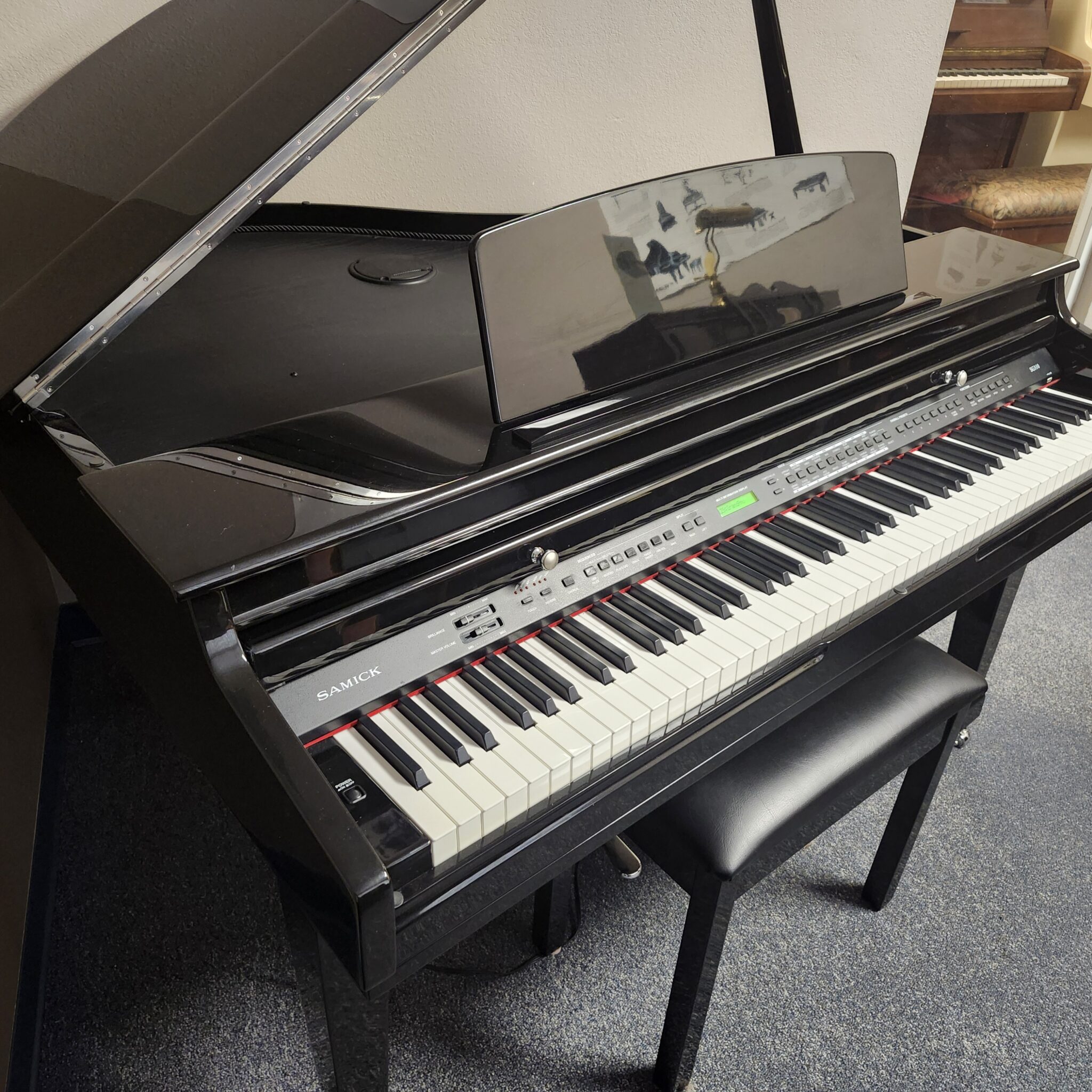 This Samick Ebony Digital Mini-Grand is about a dozen years old, and lightly used. It has a nice piano tone, and a fully-weighted hammer action. Like all digitals, it can be played silently, on headphones too! And this one is only 48″ deep, designed to fit in nearly any corner or open space. Looks good from any angle! Includes matching bench. We don’t often see digital grands we feel are worth picking up in this price range, so grab it while you can.