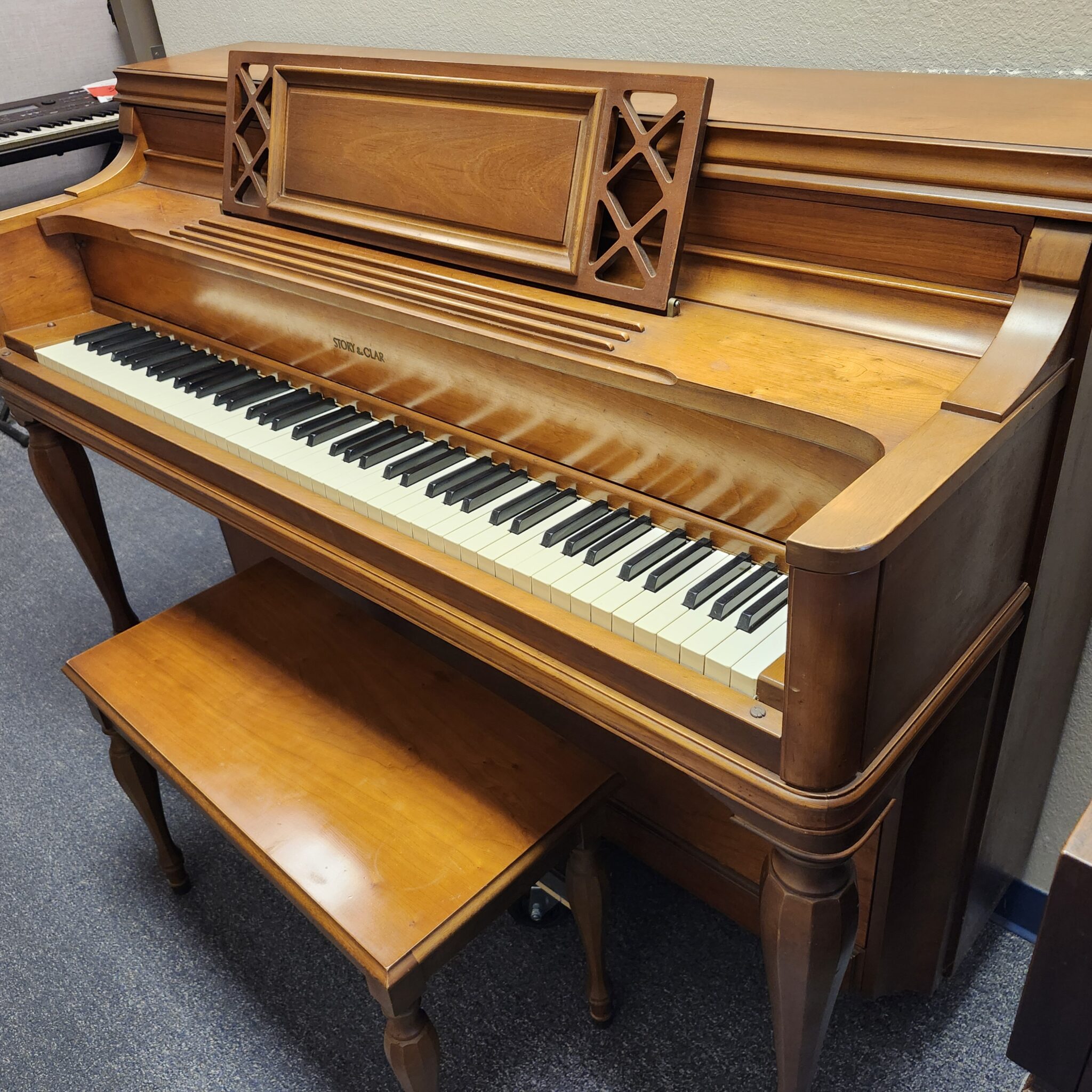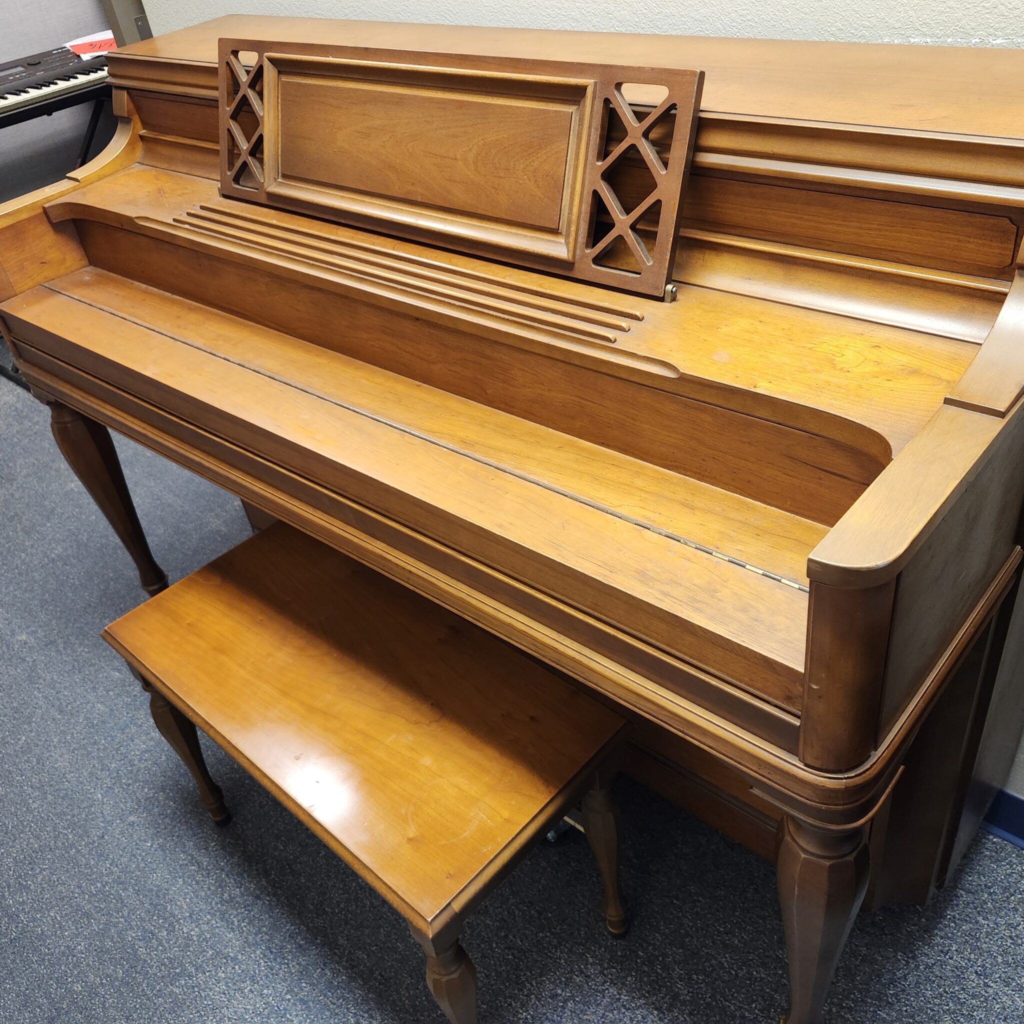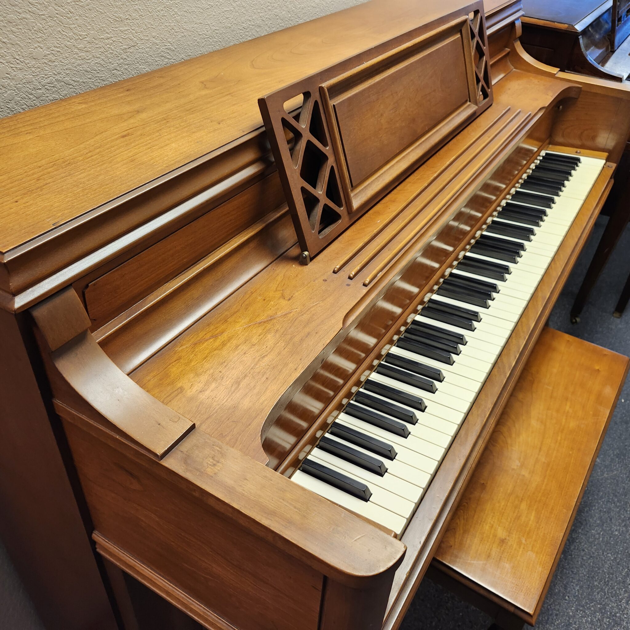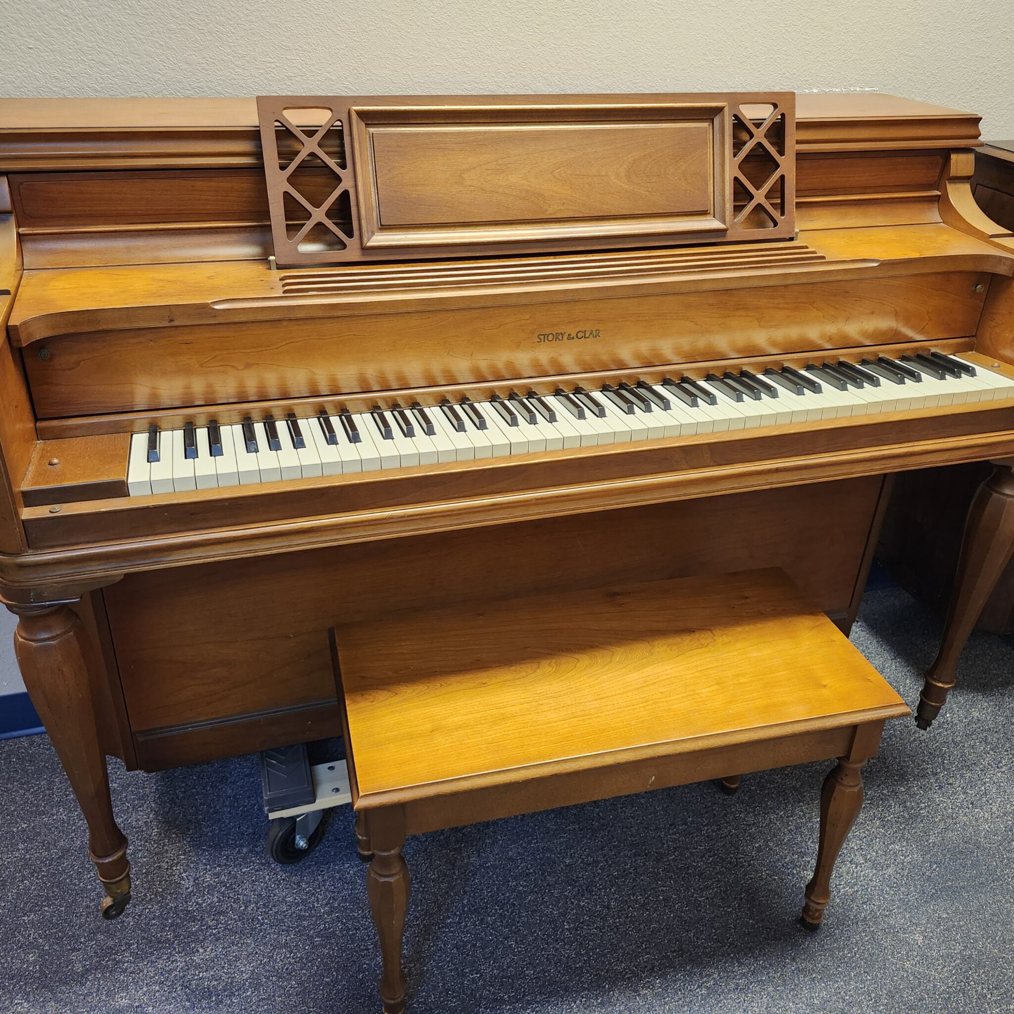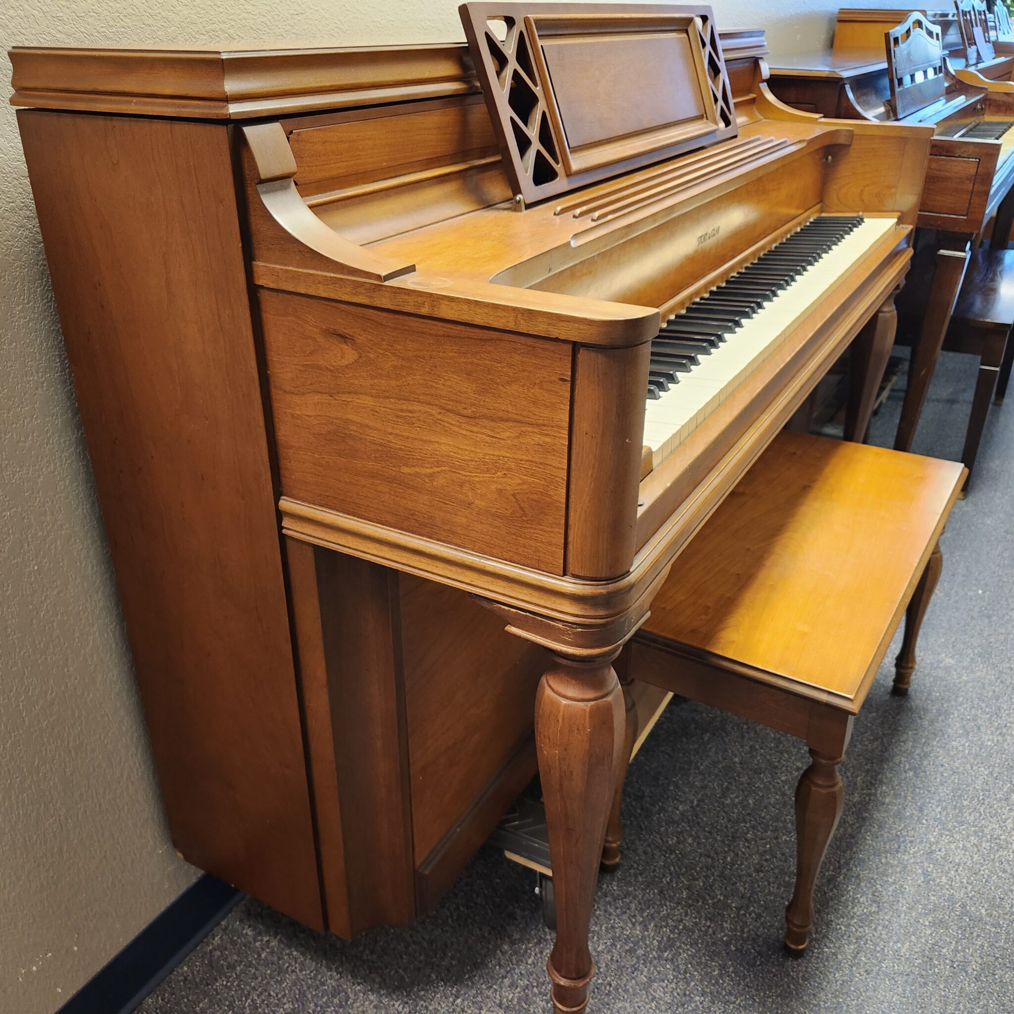 This Story & Clark Light Cherry Console Piano for sale is a great value. Last owned by a music teacher who truly loved the tone, this piano has held up exceptionally well. Full, clean tone that is pleasing and easy to get out of the little 40″ console, this classic gem will fit nicely on your wall and invite you to make music each day. Cabinet has the flowing swirl of cherry wood, in a light stain that is almost golden in hue. Simple lines fit many decor schemes. This is a piano that was new in the 60s but still has a lot music left to offer.