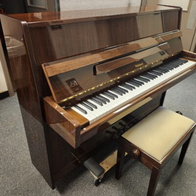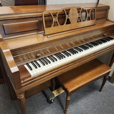 This Weber Cherry Console was purchased new from The Piano Guys just ten years ago! And we have followed its life closely–well cared for. Made by the Korean Young Chang company, it features a warm, pleasing tone. Even touch is accessible for players at most levels. Rare find–they don’t back this soon too often!