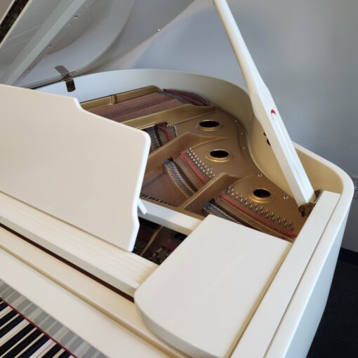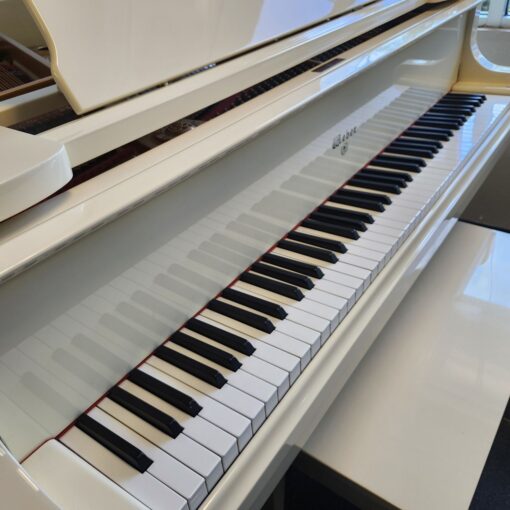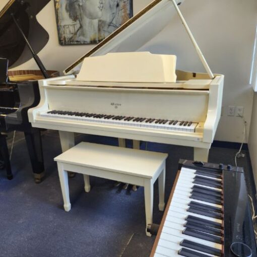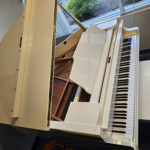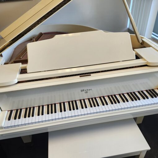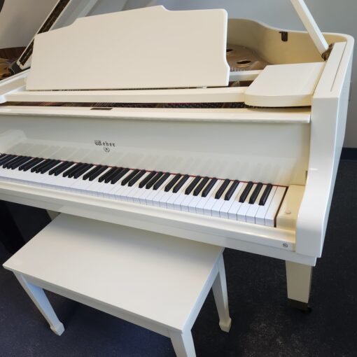 This Weber Ivory Baby Grand Piano offered for sale by The Piano Guys is a solid used grand in very good condition. Made in Korea by the Young Chang company in the 90s, this piano was lovingly treasured and regularly tuned. It has a clear powerful tone, and is moderately easy to play. It comes in a 5′ cabinet, which has a nice even ivory color, with the finish in very good condition as well. Makes quite a statement in any Florida home. This price range is moving very quickly this year, so please don’t wait if this is your piano and color.