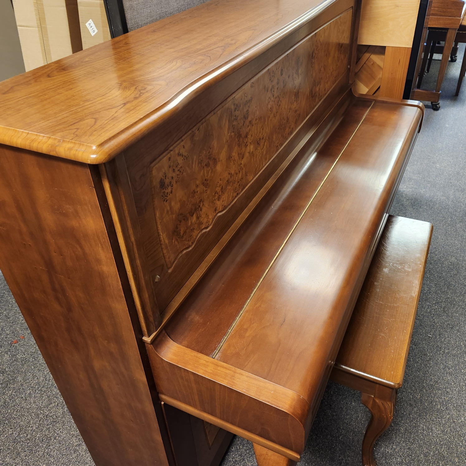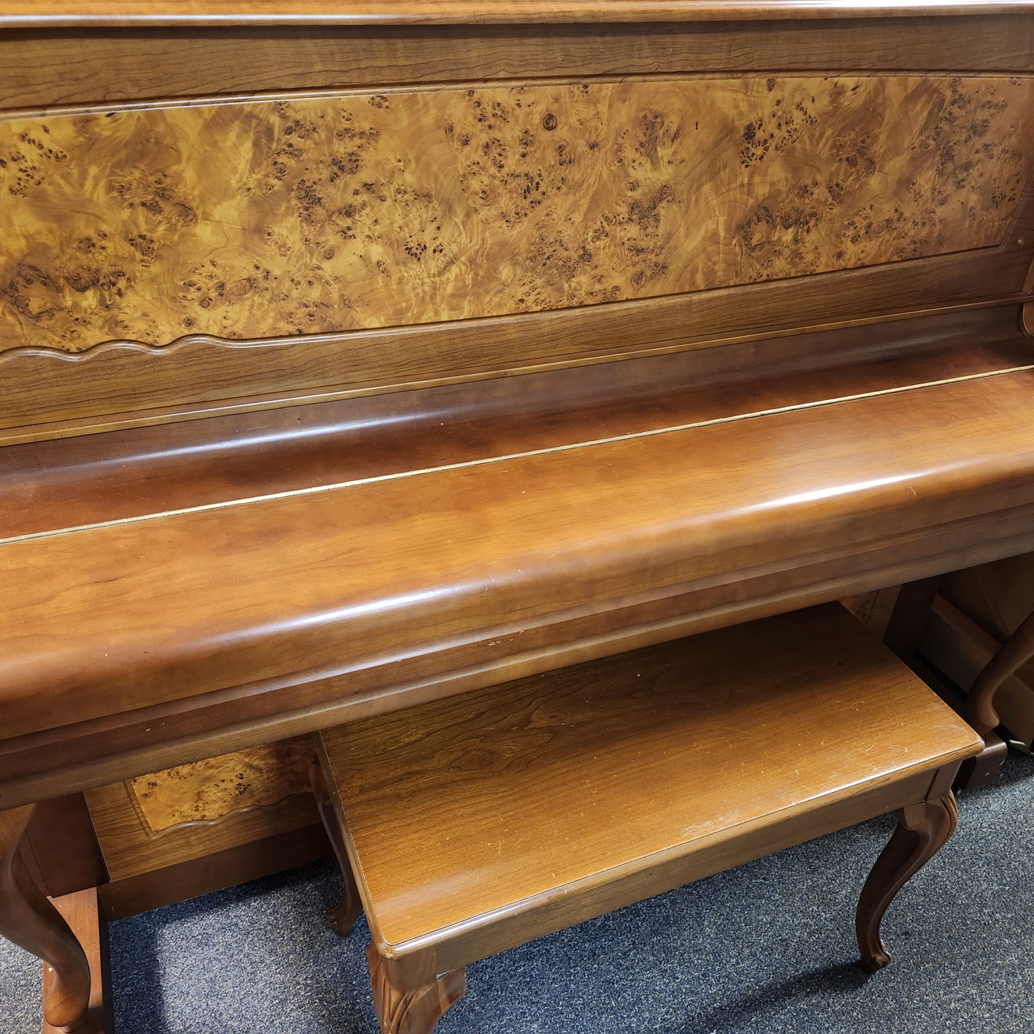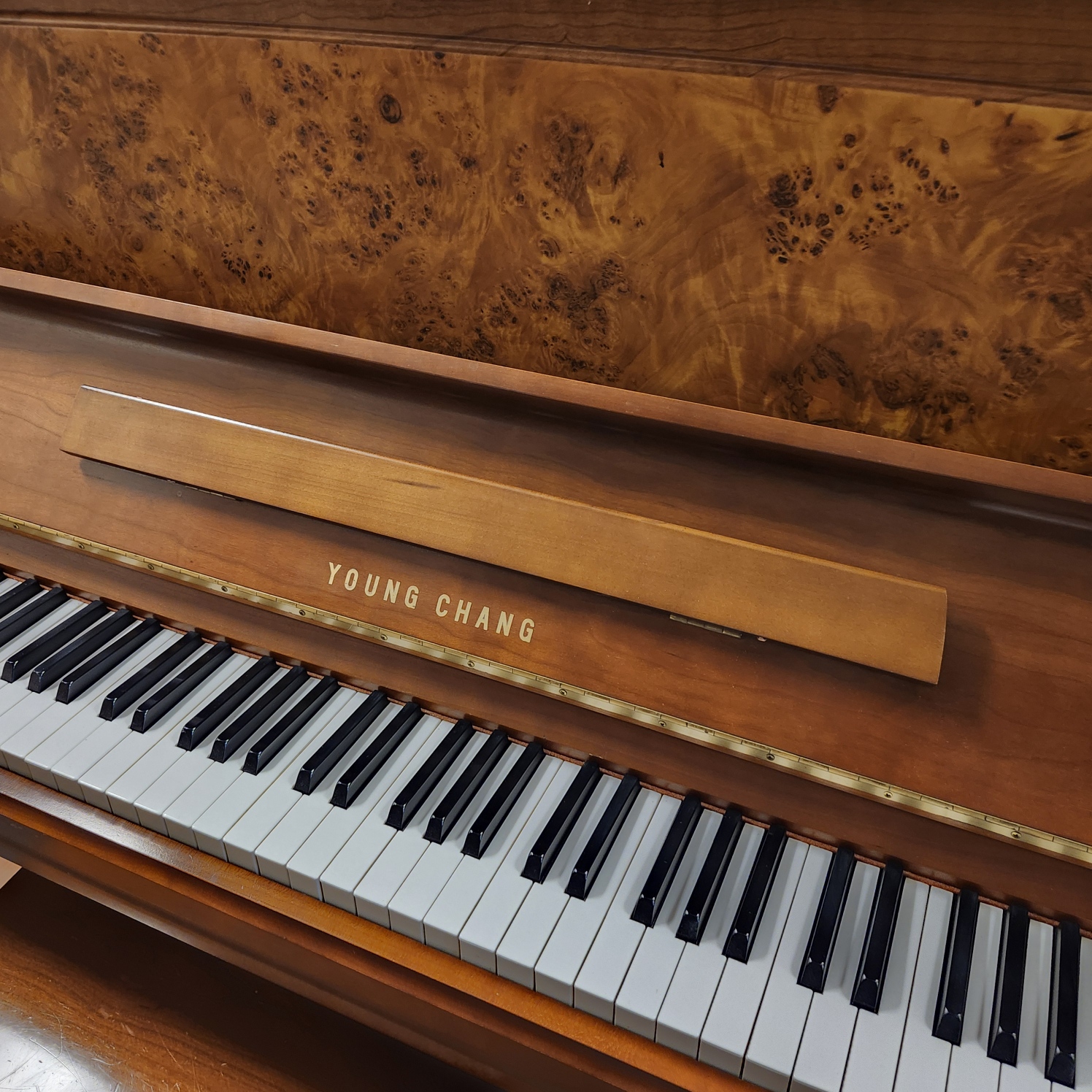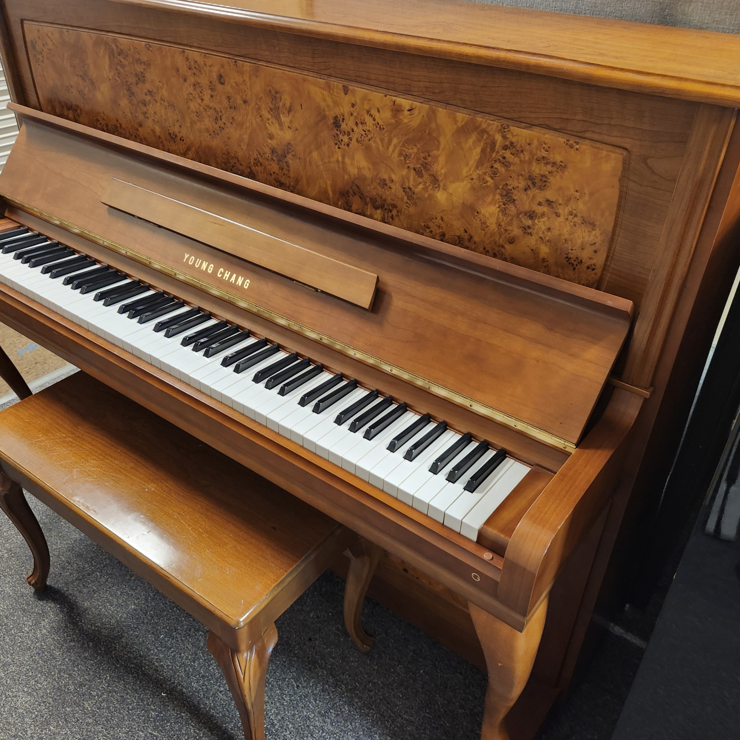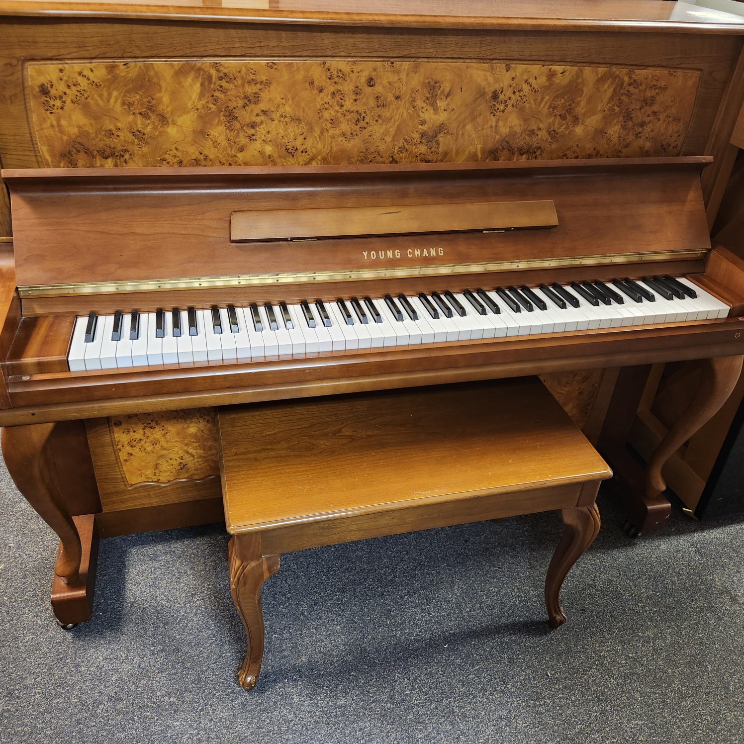 This Young Chang Walnut Studio is special. It is nearly new, with very little wear and tear. And it features a unique cabinet design, with a beautiful front panel of burled walnut, framed by solid pieces, all boasting a rich brown hue. And it has the elegant curved legs attached to toe blocks, a design with a great following in many parts of Europe as well as Asia. And the 48″ studio has a lovely tone, similar to the top Yamaha studios. This makes sense, since Young Chang got its start as the Korean wing of the Yamaha company, till the Kim brothers split off to do their own thing in the 1950s. Great value on a premium piano!